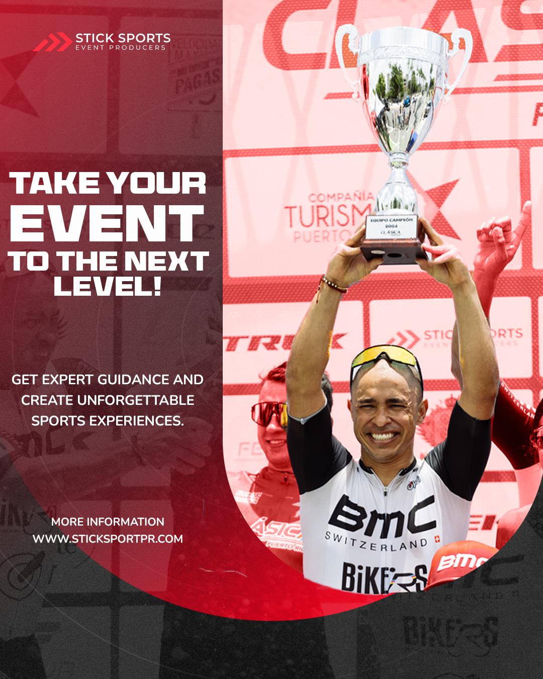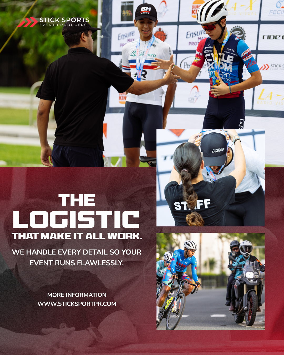 Stick Sports, is a Puerto Rican leading company in the design, organization, and management of top-tier local and international sporting events. With a strong expertise in event logistics and direction, we ensure every detail is meticulously planned and executed. For us, sports are not just a routine—they are a passion that fuels everything we do. We believe in upholding the highest standards of ethics and fairness, striving for extraordinary results in every event we manage. Superior quality is the foundation of our organization, and our commitment to excellence drives us to continuously elevate the sports experience for athletes and spectators alike.